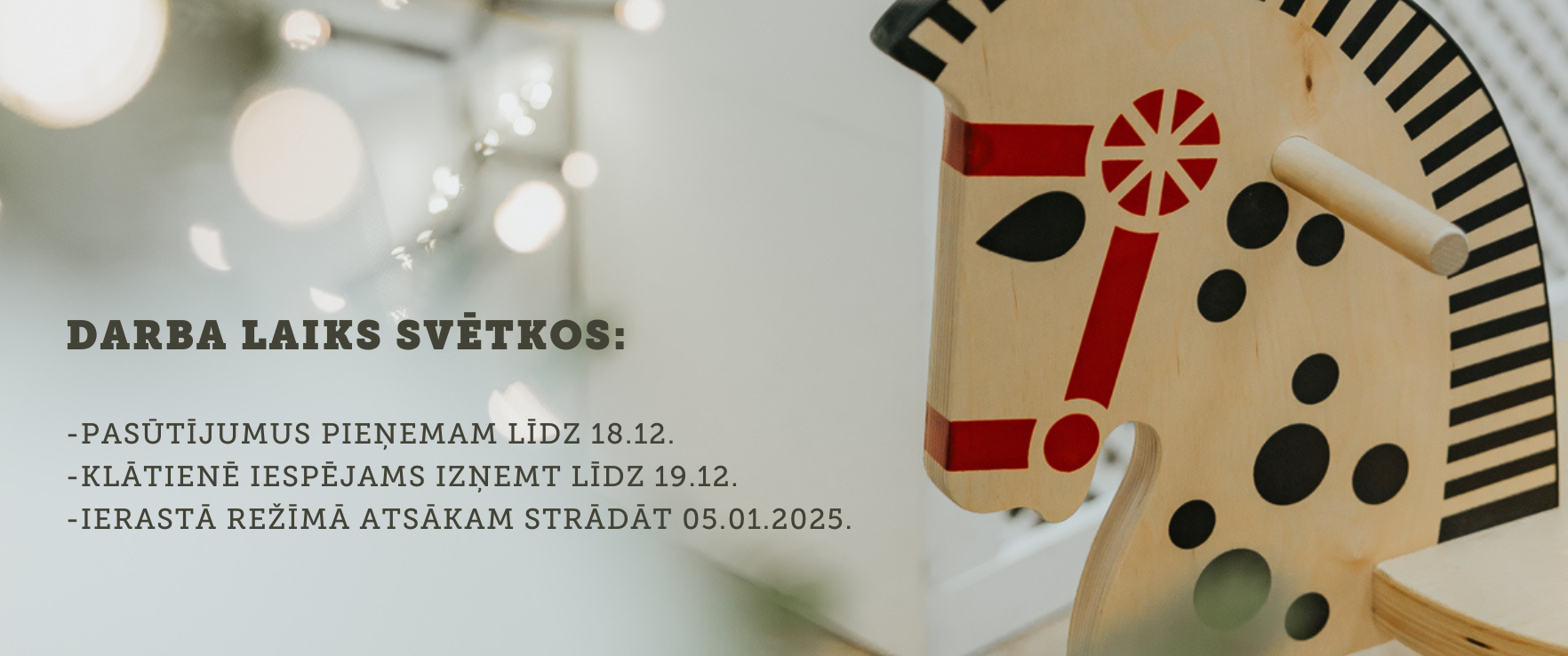 No 20. decembra līdz 4. janvārim atpūšamies. Pasūtījumus, kas veikti šajā laika periodā, apstrādāsim sākot no 5. janvāra.